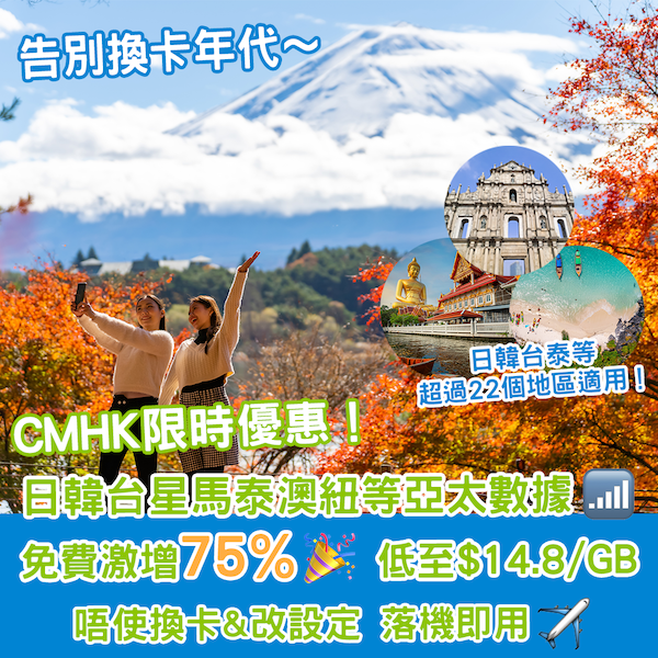 【告別換卡年代】CMHK GO! Pass限時優惠!漫遊數據免費增量兼冇每日用量限制,低至$6/GB!唔使換SIM,落地即用,多達22個地區適用,分分鐘平過買卡!#以上價錢只供參考,如有出入,則以預訂網址為準。以上圖片只供參考。優惠受條款及細則約束,建議預訂前先行細閱